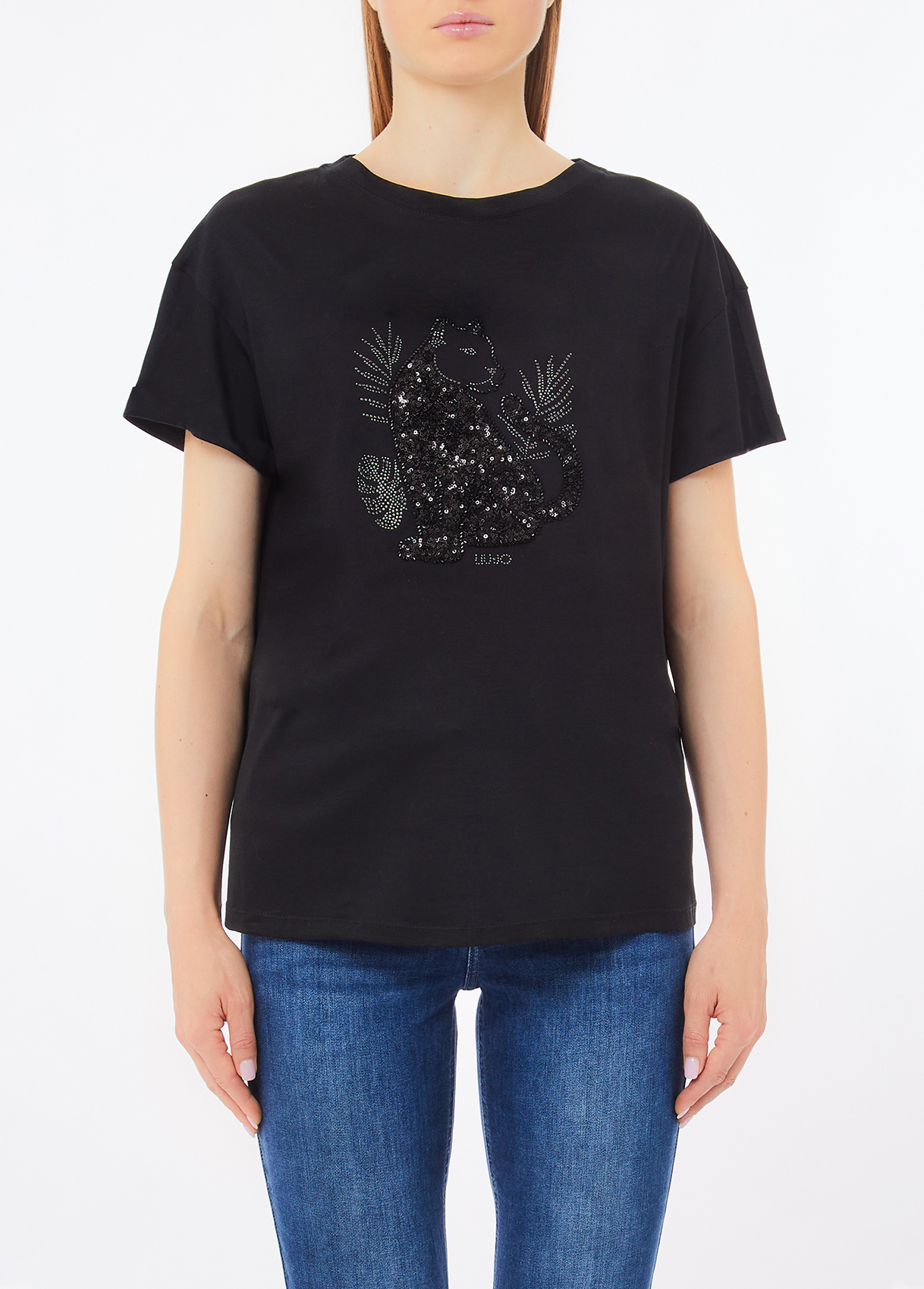 Liu Jo T-shirt In Cotone Con Paillettes E Strass, Nero/pantera, S