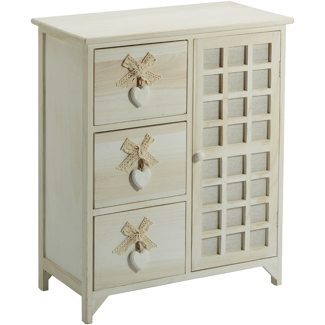 Cassettiera 3 Cassetti Con Cuore + Anta Colore White Washed In Legno Di Paulownia