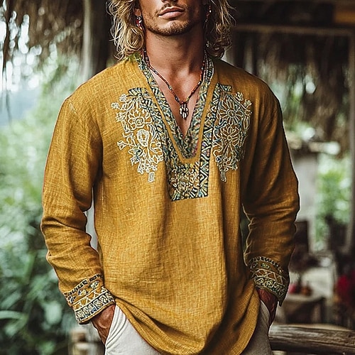 Per uomo Camicia popover Camicia Estiva Abbigliamento da spiaggia Camicia vintage Camicia etnica Floreale Vacanza Ferie Giallo Blu Arancione Marrone Manica Lunga Scollo a V Estate Primavera