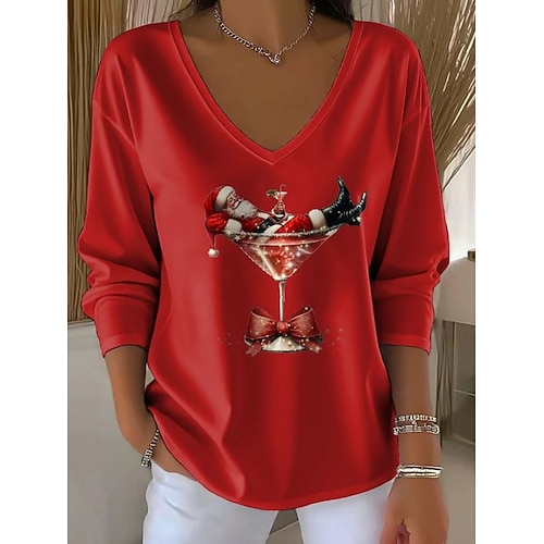 Natale Per donna Maglietta Stampato Grafico Babbo Natale Natale Vintage Elegante Classico Manica Lunga Scollo a V Top Regolari Quotidiano Nero Bianco Rosso Verde Grigio Primavera Autunno Inverno