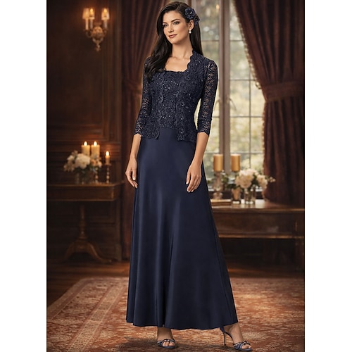 Linea ad A Tre Pezzi Lunghezza al pavimento Abito da invitata a nozze Abito da cerimonia per signora Manica 3/4 Collo quadrato Elegante Semplice Lussuoso Formale Ospite di nozze Raso Pizzo con Pizzo