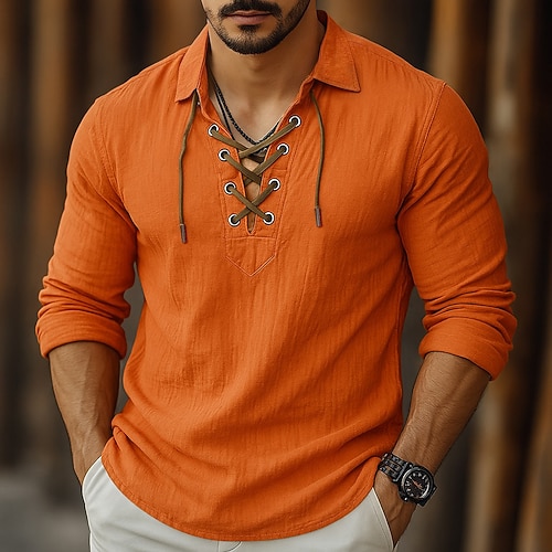 Per uomo Camicia Camicia di lino Stile vichingo Camicia Estiva Abbigliamento da spiaggia Tinta unica Vacanza Streetwear Bianco Arancione Verde Azzurro Manica Lunga Collo ripiegato Abbigliamento
