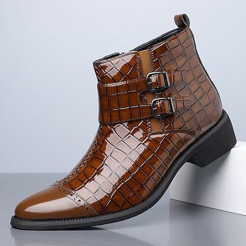 stivali da uomo marroni con doppia fibbia, tomaia in coccodrillo goffrato, design formale ed elegante per lavoro, matrimoni e occasioni speciali