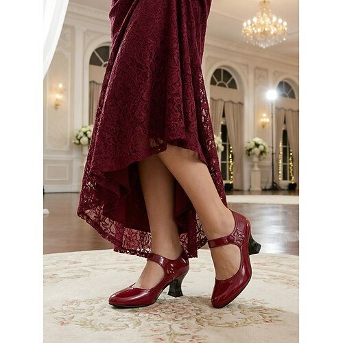 scarpe col tacco Mary Jane gialle vintage anni '20 da donna: décolleté con tacco ricurvo e ritagli, look classico in vernice per feste Gatsby, balli swing e occasioni speciali