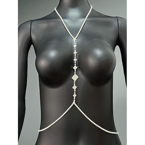Catena per il corpo da donna in argento con strass a forma di diamante - gioiello glamour con scollatura profonda per feste serali, abbigliamento da discoteca, matrimoni e occasioni speciali
