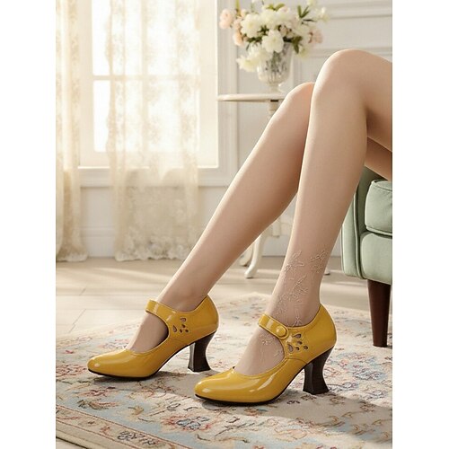 scarpe col tacco Mary Jane gialle vintage anni '20 da donna: décolleté con tacco ricurvo e ritagli, look classico in vernice per feste Gatsby, balli swing e occasioni speciali