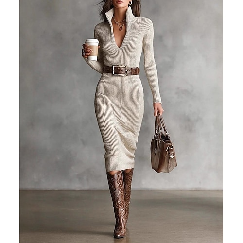 Per donna Abito Midi Abito in maglia Vacanza Casual Ufficio Quotidiano Data Semplice Manica Lunga Collo alla coreana Beige