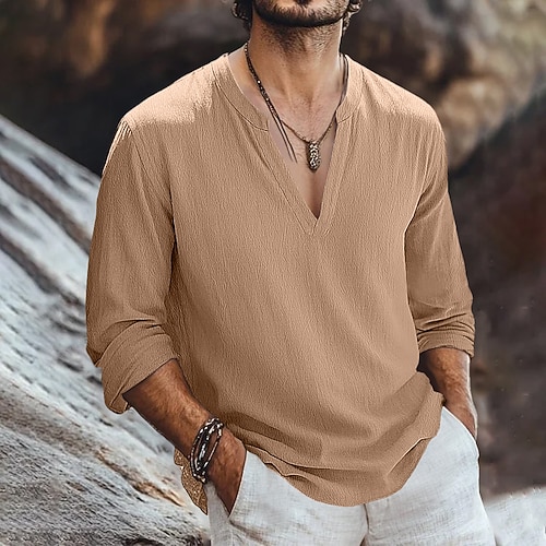 Per uomo Camicia Camicia di lino Stile vichingo Camicia Estiva Abbigliamento da spiaggia Tinta unica All'aperto Vacanza Verde Beige Manica Lunga Scollo a V Estate Primavera Abbigliamento
