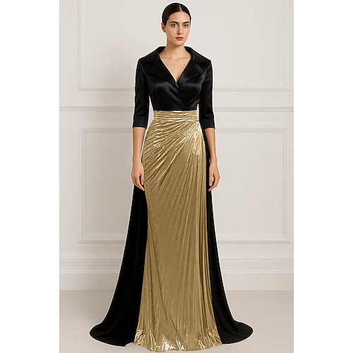 Linea ad A Lunghezza al pavimento Abito da Sera Abito da ballo con sopragonna Abito formale Elegante Setoso Manica 3/4 Bavero Matrimonio Formale Abito Champagne per la Madre della Sposa Raso con