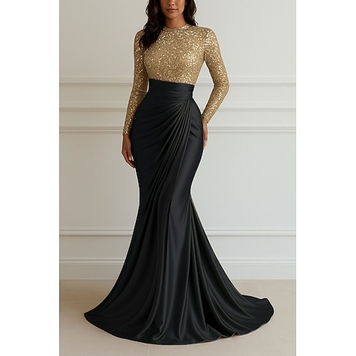 Sirena Tromba Lunghezza al pavimento Abito da Sera Elegante Setoso Manica Lunga Girocollo Matrimonio Formale Abito Champagne per la Madre della Sposa Raso Elasticizzato con Glitter Pieghe